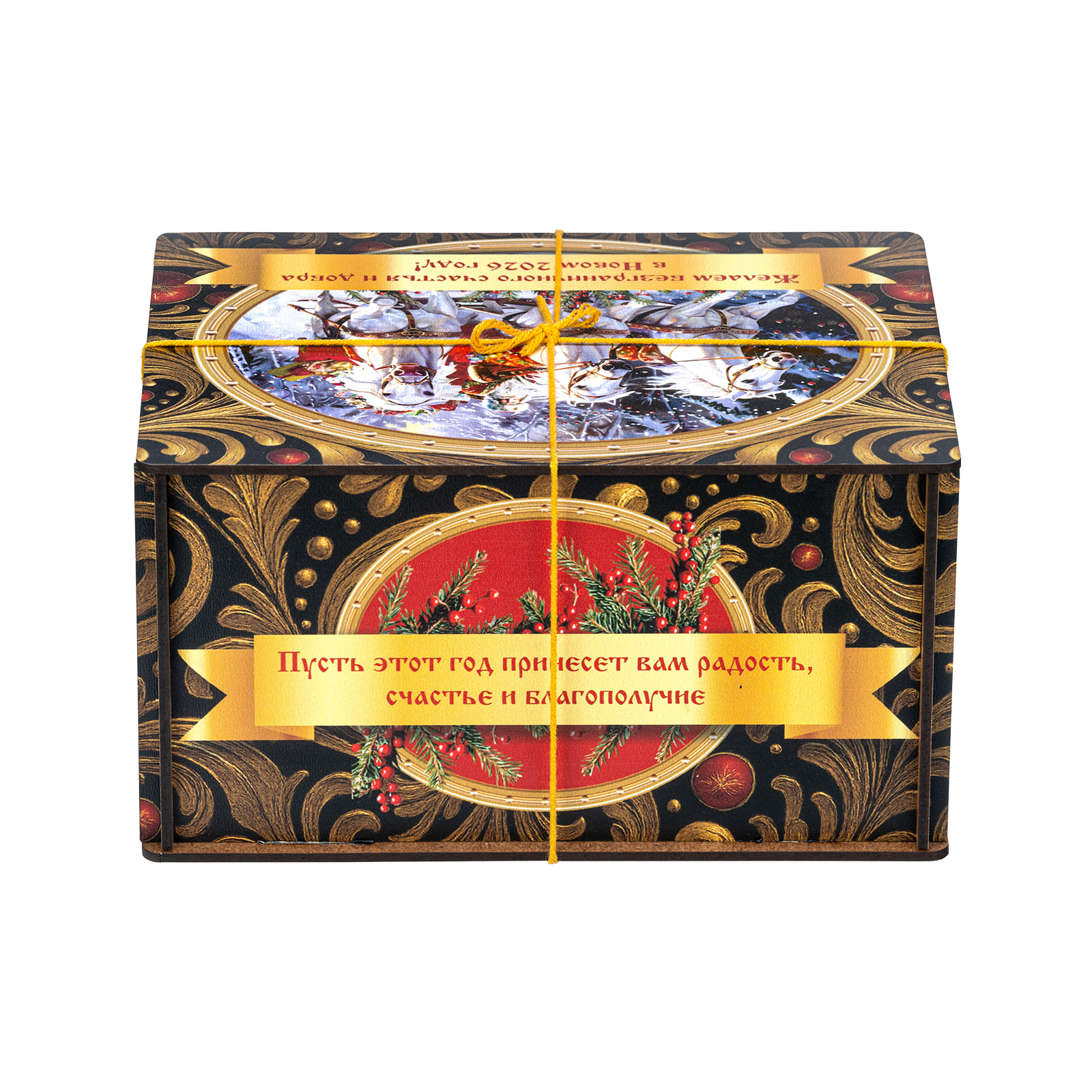 Ищете новогодний сладкий подарок для взрослого сластены? Тогда набор “Посылка Черный бархат” - это то, что вам нужно! В его состав входит целых полтора килограмма разнообразных отборных сладостей на любой вкус! В нем есть шоколадные конфеты с самыми разнообразными начинками, батончики, печенье, халва, а также многие другие любимые лакомства. Кроме сладкого наполнения, в состав подарка входит небольшой памятный сувенир в виде символа наступающего года. Все это бережно упаковано в празднично украшенный деревянный ящичек, перетянутой ярко-желтой ручкой-шнурком. Прям настоящая волшебная посылка!
