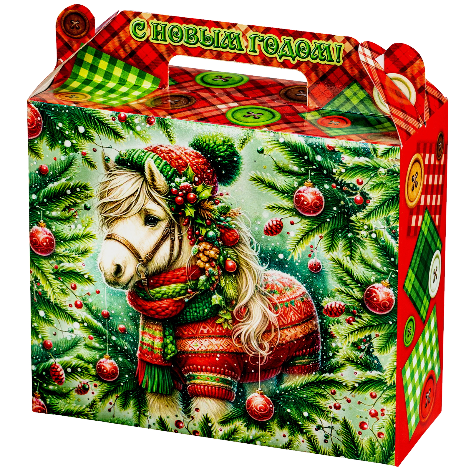 Интересный вариант новогоднего подарка – «Пуговка». Он представлен в разделе Картон. Отлично подойдет на подарок в 2026 году с символом Лошадь. Внутри такого презента находится кондитерский набор весом 500 граммов.