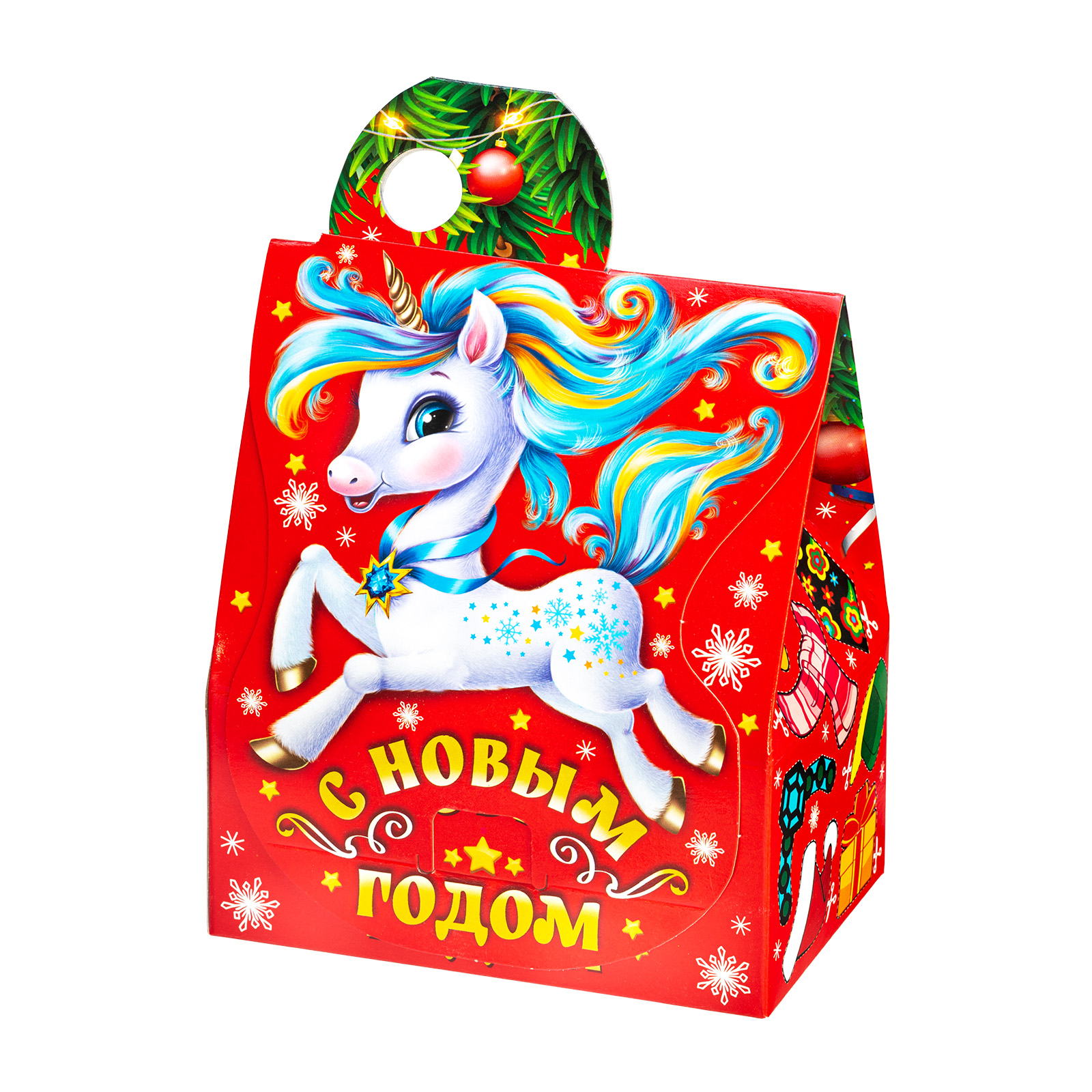 Ищете небольшой, но при этом очень вкусный сладкий подарок для детского праздника? У нас есть для вас предложение! Набор “Сказки лошадки” - это то, что гарантированно вызовет восторг у маленького сластены. Это небольшая картонная коробочка в форме уютного домика с удобной ручкой сверху. Фон упаковки - празднично красный, на нем со всех сторон присутствуют узнаваемые новогодние рисунки: снежинки, салют, елочные шарики, а на передней части главное украшение - иллюстрация в виде маленького сказочного единорога с разноцветной волшебной гривой. Внутри подарка находятся вкусные отборные сладости под любые предпочтения маленького сластены, а также небольшой памятный сувенир.