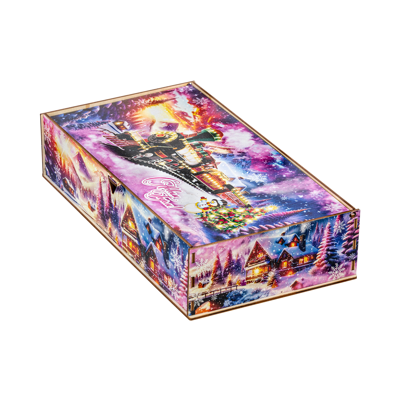Секрет идеального новогоднего сладкого подарка прост: это яркая привлекательная упаковка и вкусные сладости внутри. “Снежный экспресс” - это подарочный набор, который как раз прекрасно подходит под эти характеристики. Это небольшая деревянная коробчка с очень необычным ярким оформлением. На ней изображен зимний вечер в небольшой деревне, рядом с которой по железной дороге весело мчится праздничный поезд. В этом поезде находятся счастливые люди, которые вот-вот смогут увидеться со своими родными и друзьями и отпраздновать с ними Новый год. В подарочный набор входит килограмм разнообразных сладостей, небольшой памятный сувенир и безграничная радость для всей семьи!